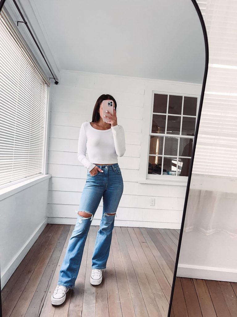 All you need is a form-fitting white long-sleeve, a classic pair of distressed jeans, and the always timeless, high-top Converse. It’s easy, cozy, and truly never goes out of style.
