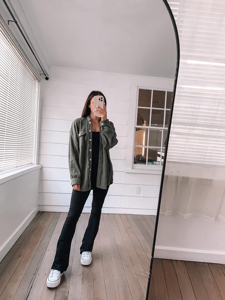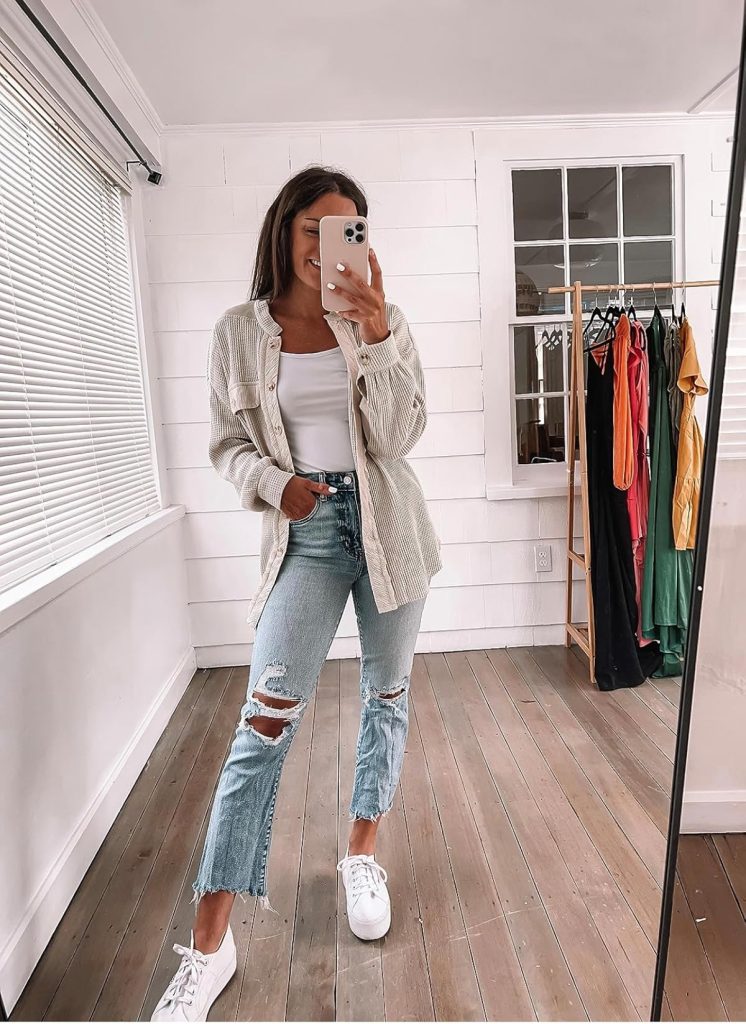 For this look, I kept it simple and wore a loose waffle knit button-down, and it worked perfectly for a fall-inspired outfit. It was soft, cozy, and even added a little extra visual interest. To keep the look easy and refined, add on a pair of white Converse—that’s all you need!
