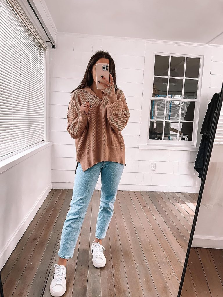 The ease of this look isn’t the only thing I love about it, though. The sweater has a fun quarter-zip style that almost makes it most like athlesiure wear, just further adding to its versatility. All you need to complete this outfit is a pair of light wash jeans and a sleek pair of sneakers.