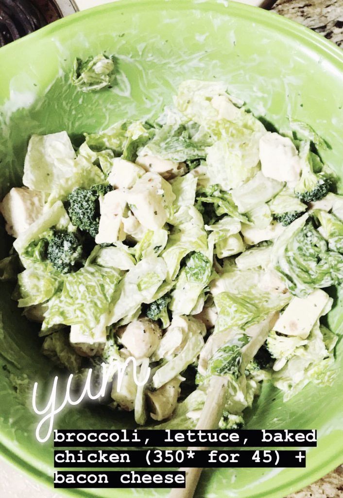 - While waiting for the chicken to cook, cut 1 broccoli and 1 bacon cheese block and add to bowl